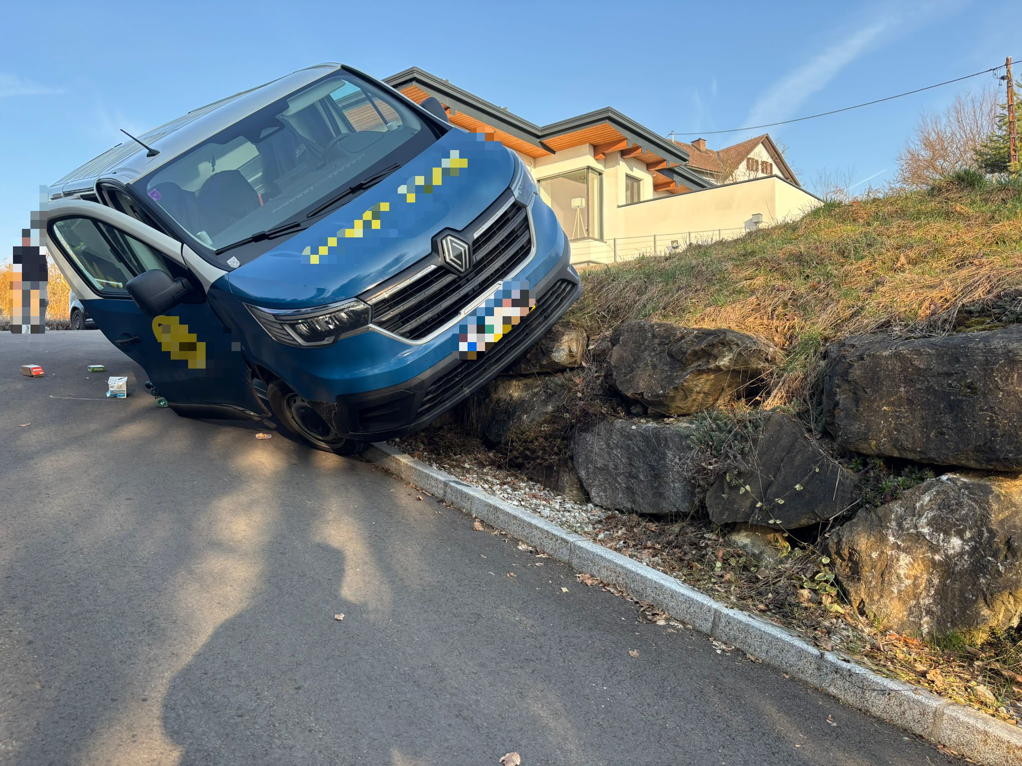 Aus noch ungeklärter Ursache kam ein Kleintransporter ins Rollen und hing auf einer Steinmauer fest.